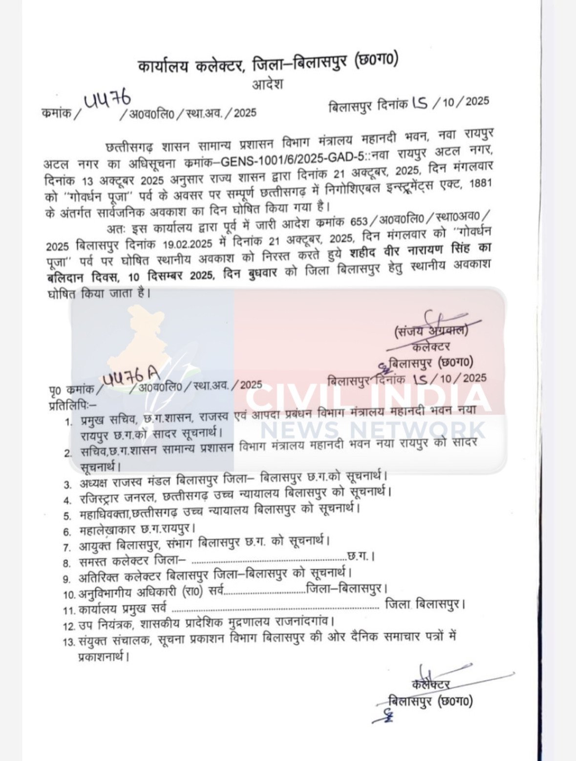 दरअसल, बिलासपुर समेत कई जिलों के कलेक्टरों ने दिवाली के दूसरे दिन 21 अक्टूबर को गोवर्धन पूजा को लोकल अवकाश घोषित किया था। मगर बाद में छत्तीसगढ़ सरकार ने कल गोवर्धन पूजा को सार्वजनिक अवकाश घोषित कर दिया। 21 को अब सरकारी कार्यालयों समेत बैंक ट्रेजरी वगैरह सब बंद रहेंगे। चूकि 21 अक्टूबर को सरकार ने सार्वजनिक अवकाश घोषित किया, इसलिए बिलासपुर कलेक्टर ने 21 अक्टूबर का लोकल अवकाश बदल दिया। बिलासपुर में अब 10 दिसंबर को शहीद वीर नारायण सिंह के बलिदान दिवस पर लोकल अवकाश दिया गया है। कलेक्टरों को अपने जिले में तीन स्थानीय अवकाश देने का अधिकार रहता है। इसी के तहत कलेक्टर अपने-अपने जिले की जरूरतों के हिसाब से लोकल अवकाश घोषित करते हैं।