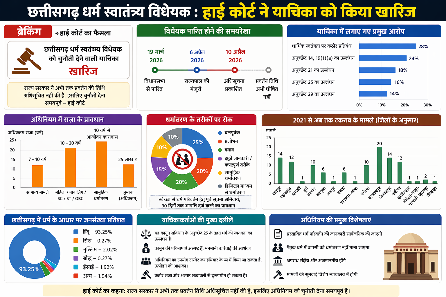 CG High Court News: बिलासपुर। छत्तीसगढ़ हाई कोर्ट ने छत्तीसगढ़ धर्म स्वातंत्र्य विधेयक 2026 को चुनौती देने वाली याचिका खारिज कर दी है। चीफ जस्टिस रमेश सिन्हा और जस्टिस रविंद्र अग्रवाल की डिवीजन बेंच ने सुनवाई के बाद कहा कि राज्य सरकार ने अभी तक कानून लागू करने की तिथि अधिसूचित नहीं की है, इसलिए इस चरण में चुनौती देना समयपूर्व है। कोर्ट ने इसी आधार पर याचिका निरस्त कर दी।