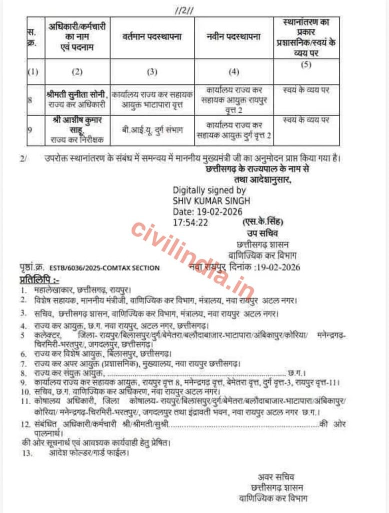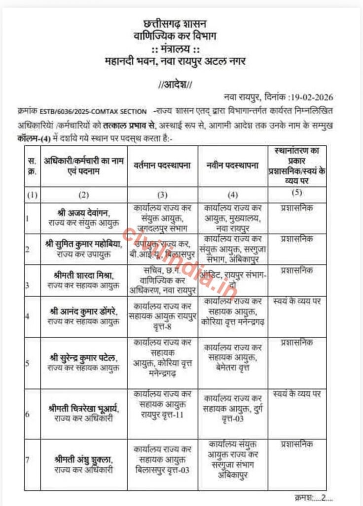 CG Transfer News: रायपुर। वाणिज्यकर विभाग के उप सचिव एसके सिंह ने प्रदेश के अलग-अलग जिलों में पदस्थ वाणिज्यकर विभाग के 9 अधिकारियों का तबादला कर दिया है। देखें स्थानांतरित होने वाले वाणिज्यकर विभाग के अधिकारियों के नाम व तबादला आदेश।