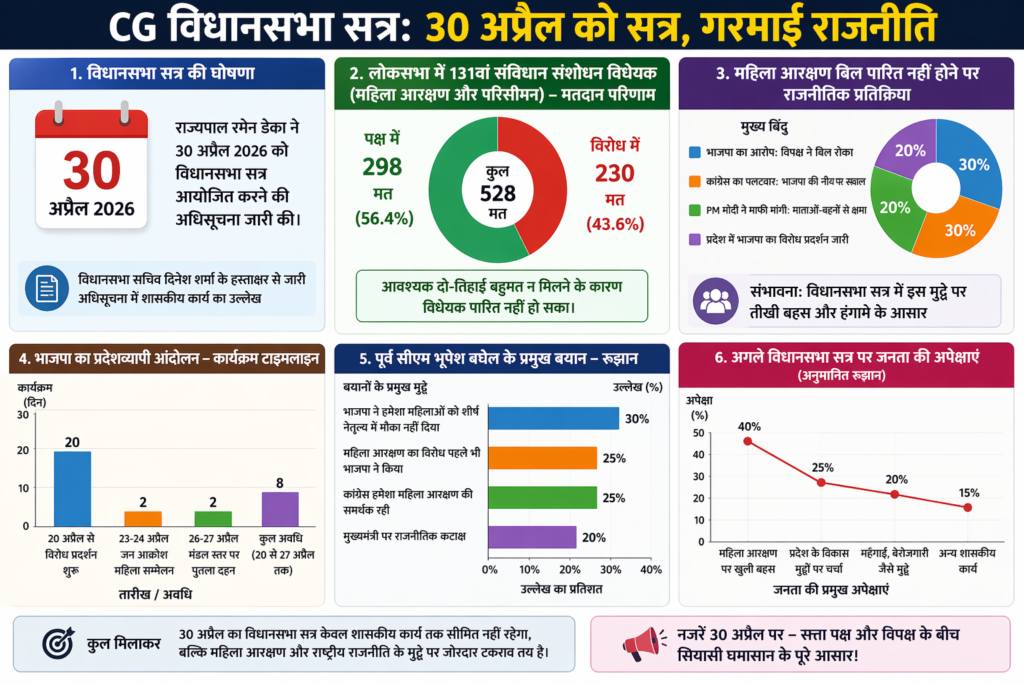 अब सभी की नजर 30 अप्रैल को होने वाले छत्तीसगढ़ विधानसभा सत्र पर है। माना जा रहा है कि यह सत्र केवल शासकीय कार्य तक सीमित नहीं रहेगा, बल्कि महिला आरक्षण और राष्ट्रीय राजनीति के मुद्दे पर जोरदार टकराव देखने को मिल सकता है।