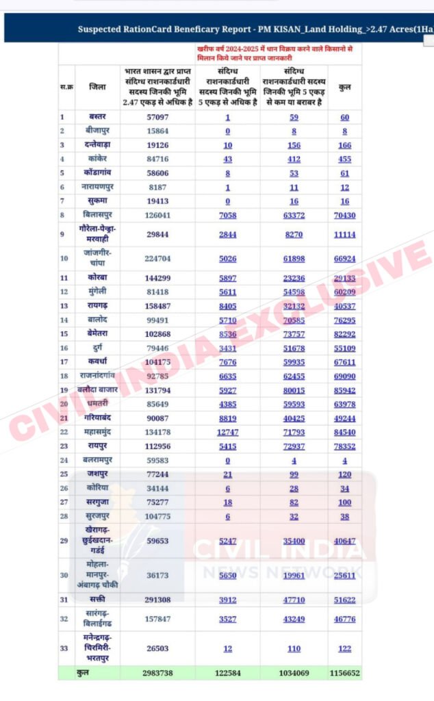 केंद्र सरकार के गाइड लाइन से यह साफ है कि बीपीएल राशन कार्डधारकों के लिए पांच एकड़ से कम कृषि भूमि होना जरुरी है। इससे अधिक होने पर बीपीएल कार्डधारक की सूची में शामिल नहीं किया जाएगा। CIVIL INDIA को मिले दस्ताावेज कम चाैंकाने वाला नहीं है। छत्तीसगढ़ में ऐसा कोई जिला नहीं है जहां बीपीएल कार्ड बनाने के नाम पर गड़बड़ी की गई हो। सर्वे में यह बात भी सामने आ रही है कि जिम्मेदारों ने मौके पर जाने के बजाय घर बैठे लोगों के नाम सूची में शामिल कर लिया है। यह बात भी सामने आ रही है कि कई वास्तविक हितग्राही जिसे योजना का लाभ मिलना है कार्ड ना बनने के कारण बीपीएल की सूची से अब भी बाहर हैं। किसानों का कहना है कि कई छोटे और सीमांत किसान, जिनके पास 5 एकड़ से कम भूमि है, उनके नाम भी सूची में शामिल कर दिए गए हैं।