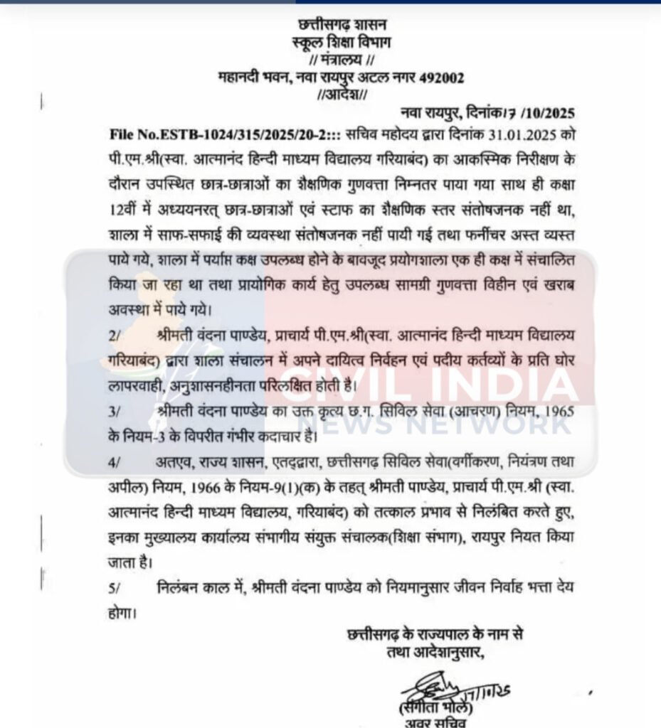 जारी निलंबन आदेश में लिखा है कि वंदना पांडे प्राचार्य स्वामी आत्मानंद हिंदी माध्यम विद्यालय गरियाबंद द्वारा स्कूल संचालन में अपने दायित्व निर्वहन एवं पदीय कर्तव्यों के प्रति घोर लापरवाही,अनुशासनहीनता परिलक्षित होती है। वंदना पाण्डेय का उक्त कृत्य छत्तीसगढ़ सिविल सेवा आचरण नियम 1965 के नियम तीन के विपरीत गंभीर कदाचार है। राज्य शासन द्वारा छत्तीसगढ़ सिविल सेवा वर्गीकरण नियंत्रण तथा अपील नियम 1966 के नियम 9 (1) (क) के तहत प्राचार्य पीएमश्री स्वामी आत्मानंद को तत्काल प्रभाव से निलंबित कर दिया गया है। निलंबन अवधि में मुख्यालय संभागीय संयुक्त संचालक शिक्षा संभाग रायपुर नियत किया गया है।