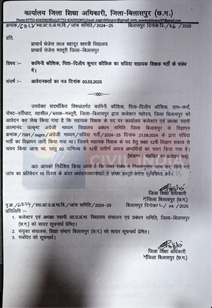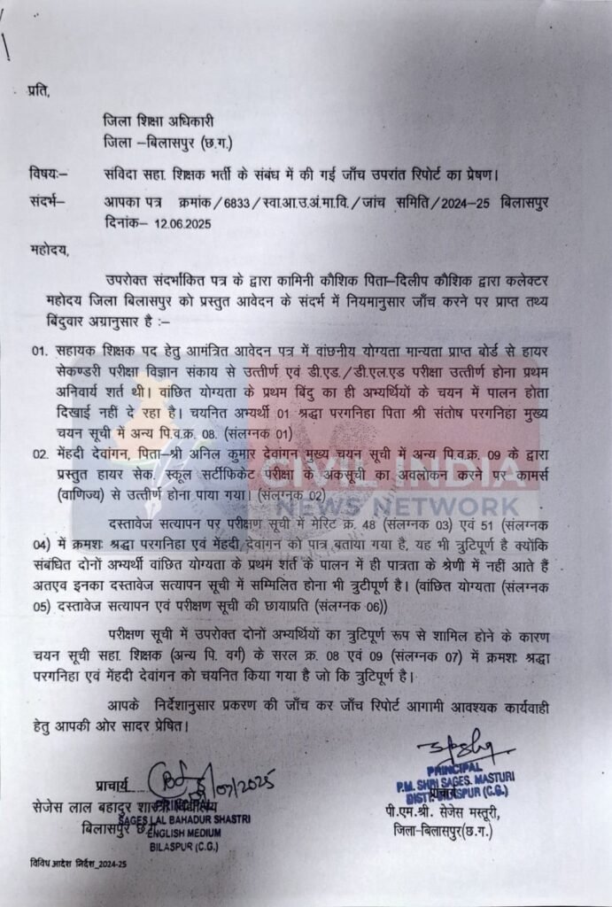 पूरा मामला तब उजागर हुआ जब कामिनी कौशिक ने कलेक्टर संजय अग्रवाल को लिखित शिकायत भेजी। गंभीर आरोपों को देखते हुए कलेक्टर ने जिला शिक्षा अधिकारी को जांच कराने के निर्देश दिए। दो प्राचार्यों की जांच समिति ने जो रिपोर्ट सौंपी, उसमें चयन प्रक्रिया में हुई कई गड़बड़ियां स्पष्ट दर्ज की गई हैं। जिले में जुलाई 2025 में संविदा सहायक शिक्षकों के 191 पदों के लिए विज्ञापन निकाला गया था, जिनमें से 55 पद सहायक शिक्षक के थे। शिक्षा विभाग ने पहले 400 उम्मीदवारों की मेरिट सूची जारी की और बाद में 275 उम्मीदवारों को दस्तावेज सत्यापन के लिए बुलाया। लेकिन अंतिम चयन सूची जारी करते समय बुनियादी योग्यता तक का पालन नहीं किया गया।