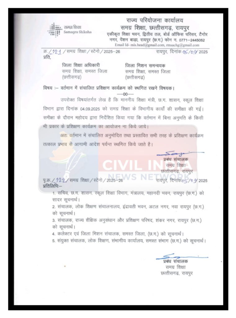 प्रदेश में बोर्ड परिणाम सुधारने के लिए DPI, समग्र शिक्षा और SCERT लगातार समीक्षा बैठकें कर रहे हैं। माध्यमिक शिक्षा मंडल रायपुर ने नए पैटर्न पर आधारित प्रश्न पत्र, ब्लूप्रिंट और अंकों के वितरण में कई बदलाव किए हैं। हर जिले में मिशन 90 प्लस, मिशन 100 और मिशन 80 प्लस जैसे अभियान चलाए जा रहे हैं। ऐसे में शिक्षकों और छात्रों पर काम का दोहरा बोझ पहले ही था। इसके बावजूद विभाग ने 5 सितंबर 2025 को जारी अपनी ही चिट्ठी को नजरअंदाज कर दिया, जिसमें साफ लिखा था कि वर्तमान में किसी भी प्रशिक्षण कार्यक्रम का आयोजन नहीं किया जाएगा और सभी प्रस्तावित प्रशिक्षण स्थगित रहेंगे। इसके बावजूद पेंड्रा के DIET सहित कई संस्थानों ने प्रशिक्षण कार्यक्रम शुरू करने का आदेश जारी कर दिया है।