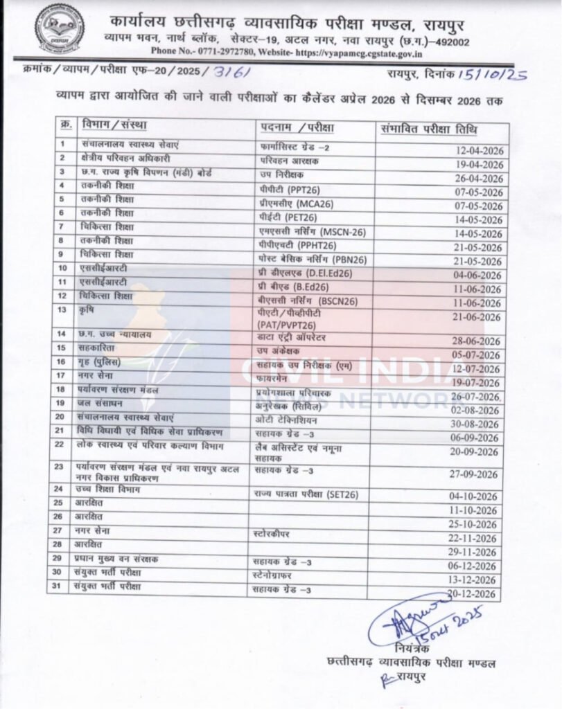 रायपुर। व्यापमं का वर्ष 2026 का परीक्षा कैलेंडर जारी हो गया है। कल गुरुवार 16 अक्टूबर को जारी कैलेंडर के अनुसार वर्ष 2026 में व्यापम के माध्यम से प्रवेश,भर्ती और पात्रता परीक्षाओं को मिला कर कुल 35 परीक्षाएं होंगी। 35 में से सर्वाधिक 23 भर्ती परीक्षाएं होंगी,पर इनमें शिक्षक और सहायक प्राध्यापक की भर्ती परीक्षा नहीं होगी। जिसके चलते इन दोनों परीक्षा की तैयारी और इंतजार कर रहे प्रदेश के युवाओं में निराशा देखी जा रही है।